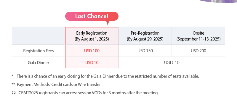 News & Notice Newsletter [Vol. 13] Last Chance – Early-bird Registration Ends Today! (Deadline: Aug. 1, 23:59 KST) Writer ICBMT 2025 Date 2025-08-01 Hits 210 Having trouble viewing this email? Click here to see it on-line List