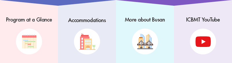 Welcome Overview Welcome Message Committee Past ICBMT Congresses Venue Related Events News & Notice Program Program at a Glance Scientific Program Social Programs Events Submission Abstract Submission Awards Presentation Guidelines Attendees Registration (Overseas) Registration (Domestic) Accommodations Transportation More about Busan Visa Sponsors How to apply Our Sponsors